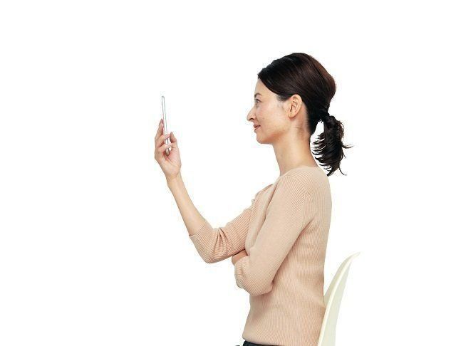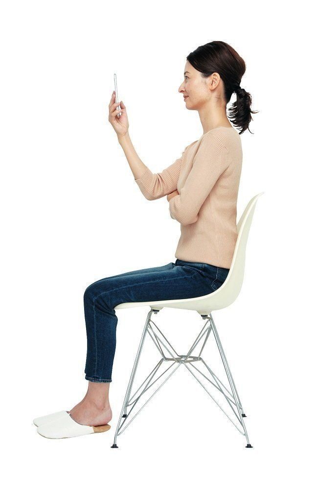 スマホを体の下のほうで持つと首が前に倒れるので、目の高さまで上げて見ましょう。腕が疲れるなら反対側の手をスマホを持っている側の二の腕の下に置いて支えるとラクです。骨盤を真っすぐに立てて座ると猫背も防げます。