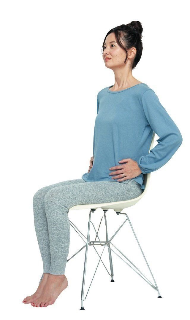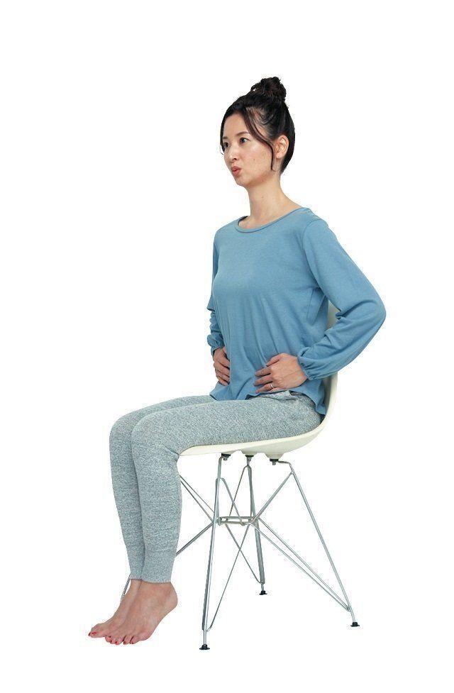 いすに座り、おなかに手を当て、口から1本の糸を吐き出すように細く長くスーッと息を吐きます。このとき、おなかが自然とへこむのを確認。