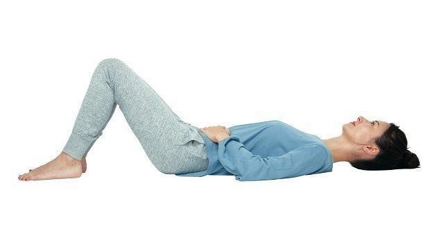 あおむけに寝て、両ひざを曲げて。両手はおなかに当て、ひじは床につけます。