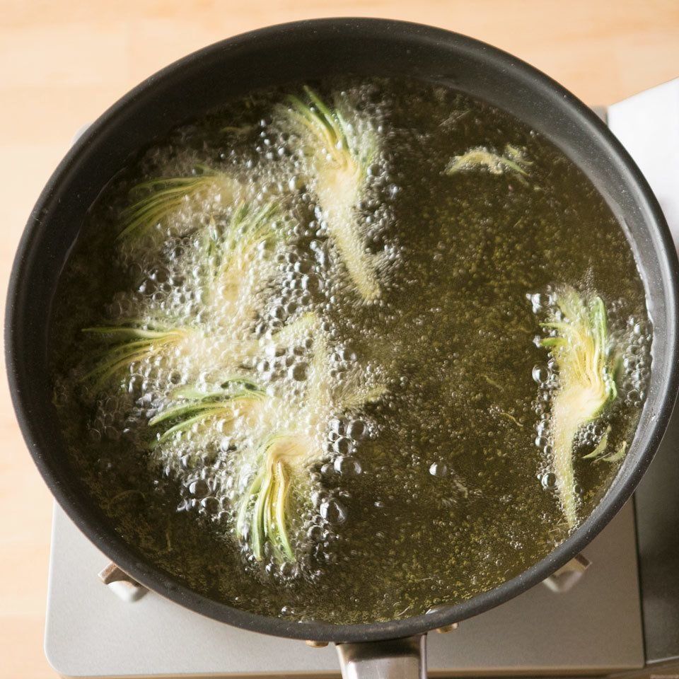 2 揚げ油は中温に熱し、アーティチョークを入れる。途中裏に返しながら、中心に竹串を挿してすっと通るまで、2〜3分揚げる。油をきって塩をふる。