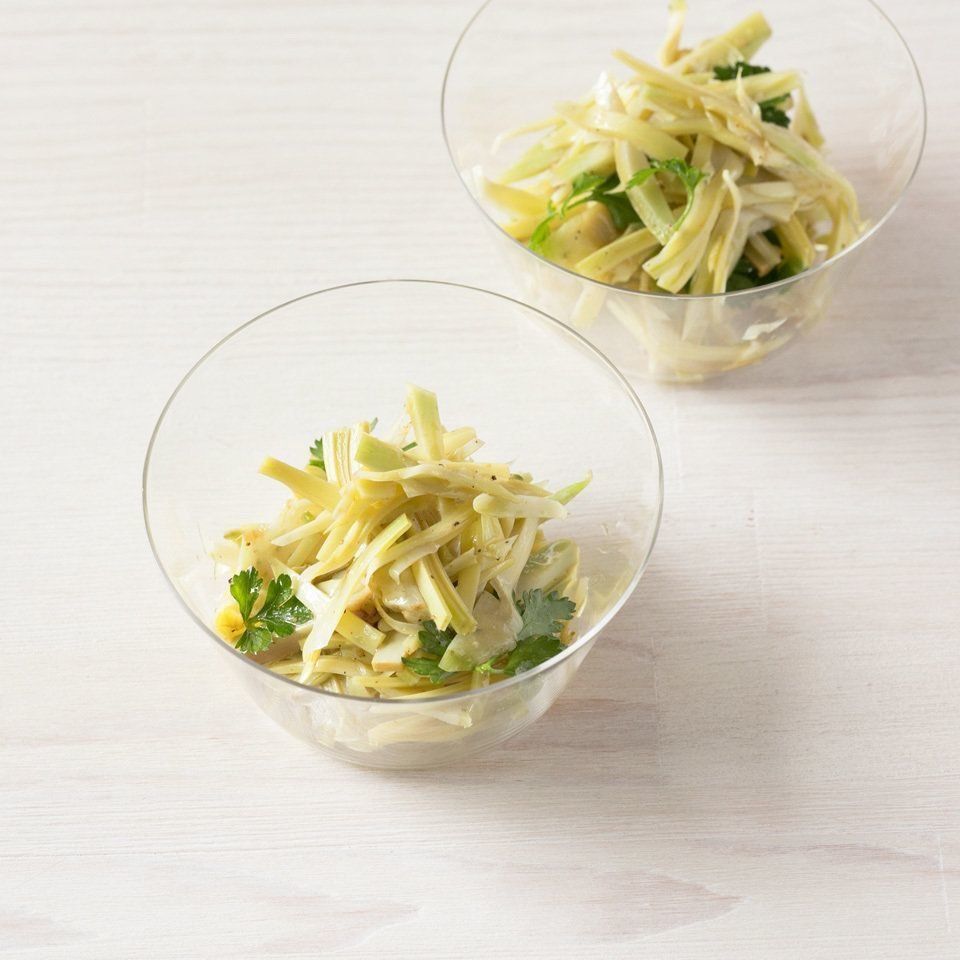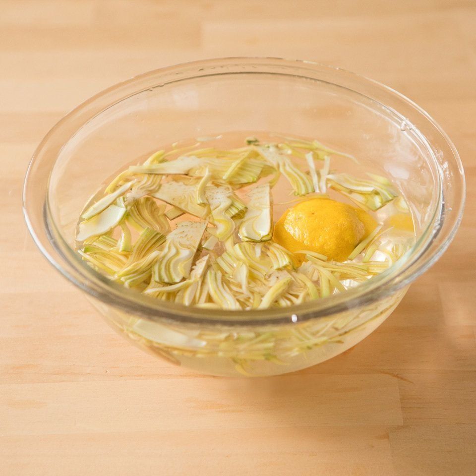 1 アーティチョークは外の硬い皮をはがし、縦半分に切る。さらに上の硬い部分を切り落とし、芯の柔らかい部分を縦に幅3〜4mmに切る。レモンの絞りかすを入れた水にさらす。