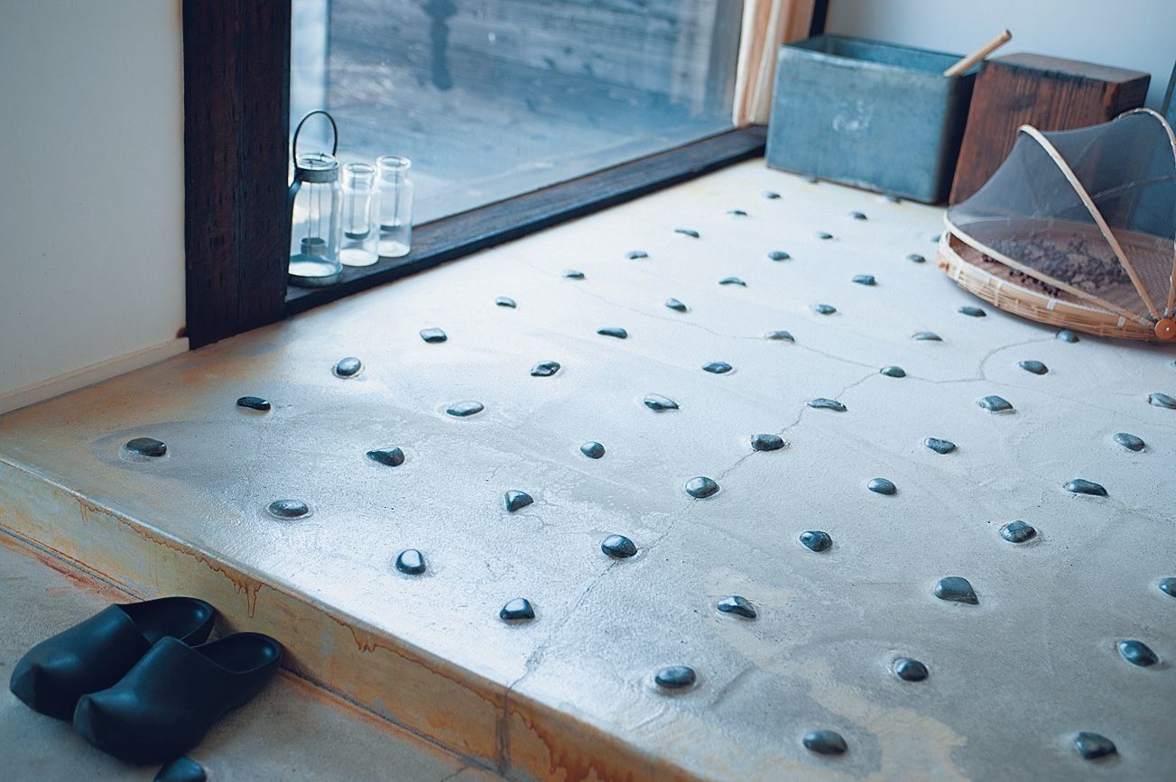 祖母宅の土間の風景を残したくて、玄関には石を埋め込みました。「世の中、変わっていくことばかりだけど、この家だけはいつまでも変わらぬ場所にしたいんです」