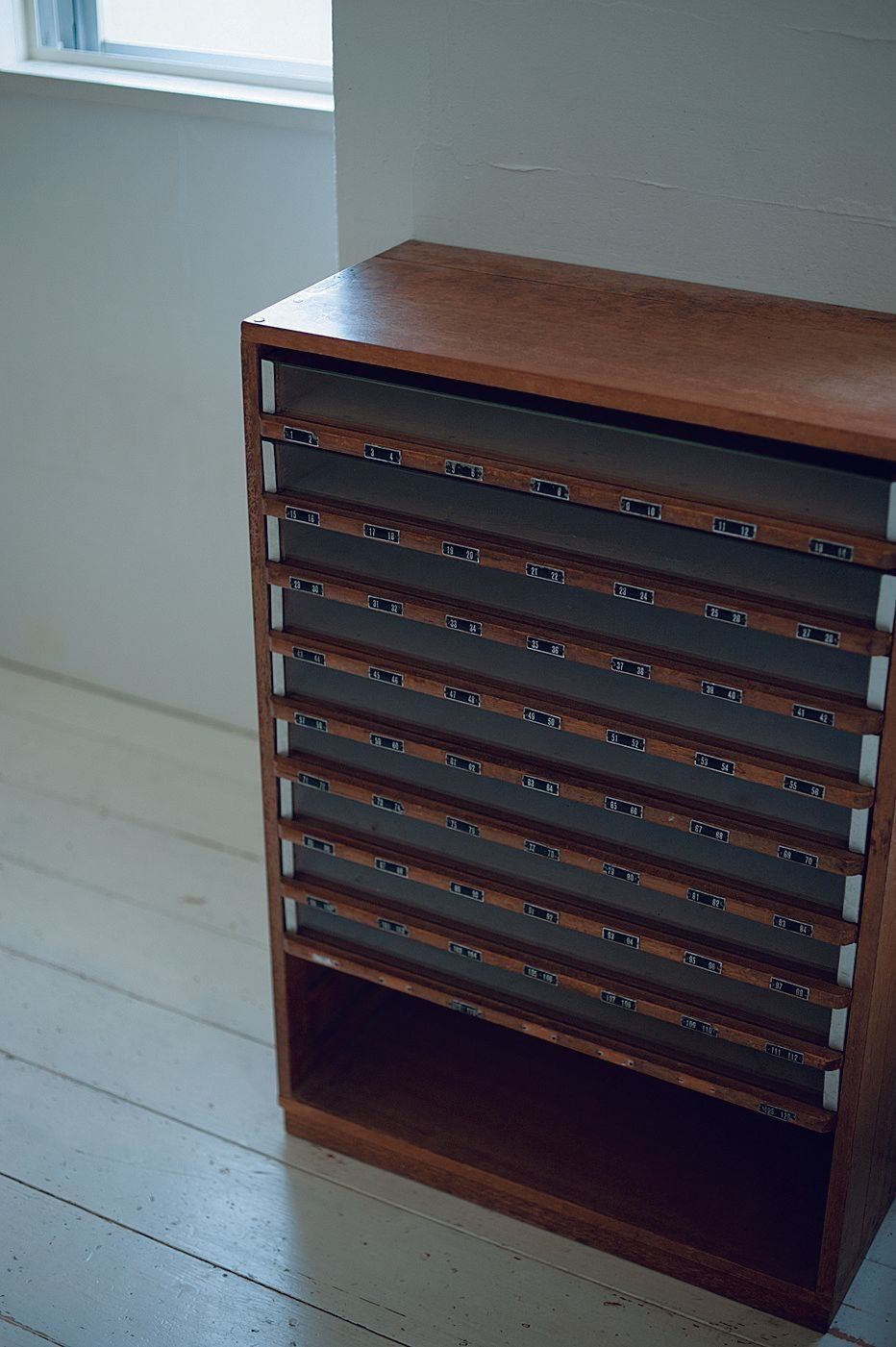 リビングにある、古道具店で見つけてきた棚。こまごまとした物の整理にぴったりですが、実はからっぽ。「中に何も入っていない〝箱〞が好きなんです」