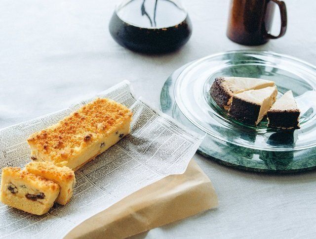 クリームチーズをふんだんに使ったベークドタイプ。表面にはサクサクしたシュトロイゼル、中にはローストしたアーモンドとレーズンが入って、ぜいたく感アップ。¥790(写真左)