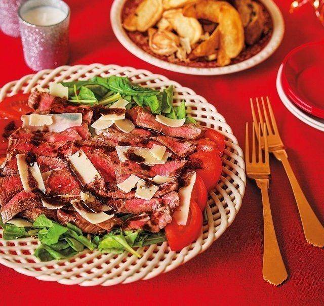 (3)盛りつける/薄くそぎ切りにし、ルッコラやトマトを敷いた器に盛る。フライパンに残った肉汁にA、2のホイルに残った肉汁を入れて中火で煮つめ、とろっとしたソースを作る。あればパルメザンチーズをピーラーで削るか粉チーズをふり、ソースをかける。