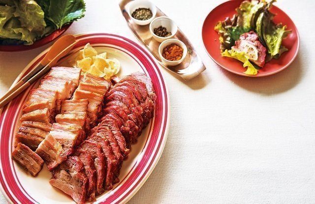 (2)焼く/塩豚は焼く30分前に室温におく。オーブン用シート(または網)を敷いた天板に塩豚をのせ、230℃に温めたオーブンで15分焼き、返して15分焼く。取り出して2~3分おいてなじませる。半分に切ってから幅5㎜に切って器に盛る。サニーレタス、青じそにレモンとともにのせ、好みで粗びき黒こしょう、カレー粉、ドライハーブをふって、巻いて食べる。