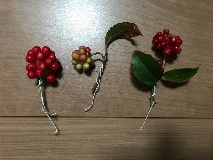 こちらのリースは、南天の実を小分けにして少しずつ麻ひもで巻いていってます。