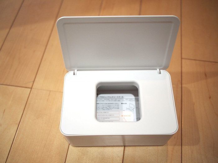 まずはふたをパカっと開けてみました。何の苦労もなくふた。赤ちゃんのおしりふきなどを入れて使用している人が多いように思います。この簡単さは、迅速な対応を求められる場面で感涙ものですね…!素晴らしい開きっぷりです。