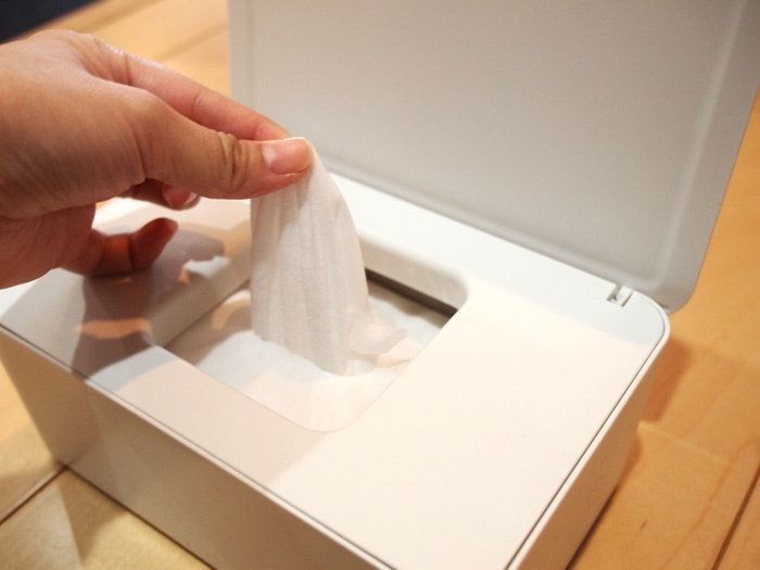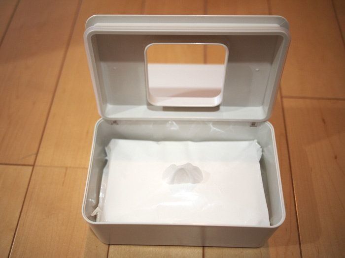 早速ウエットシートをセットしてみました。ウェットシートのテープは全剥がしを推奨しているようです。きちんと中が乾かないようにサイドがゴムで覆われているので安心ですね。大抵のウェットシートなら入るサイズ感も素敵です。