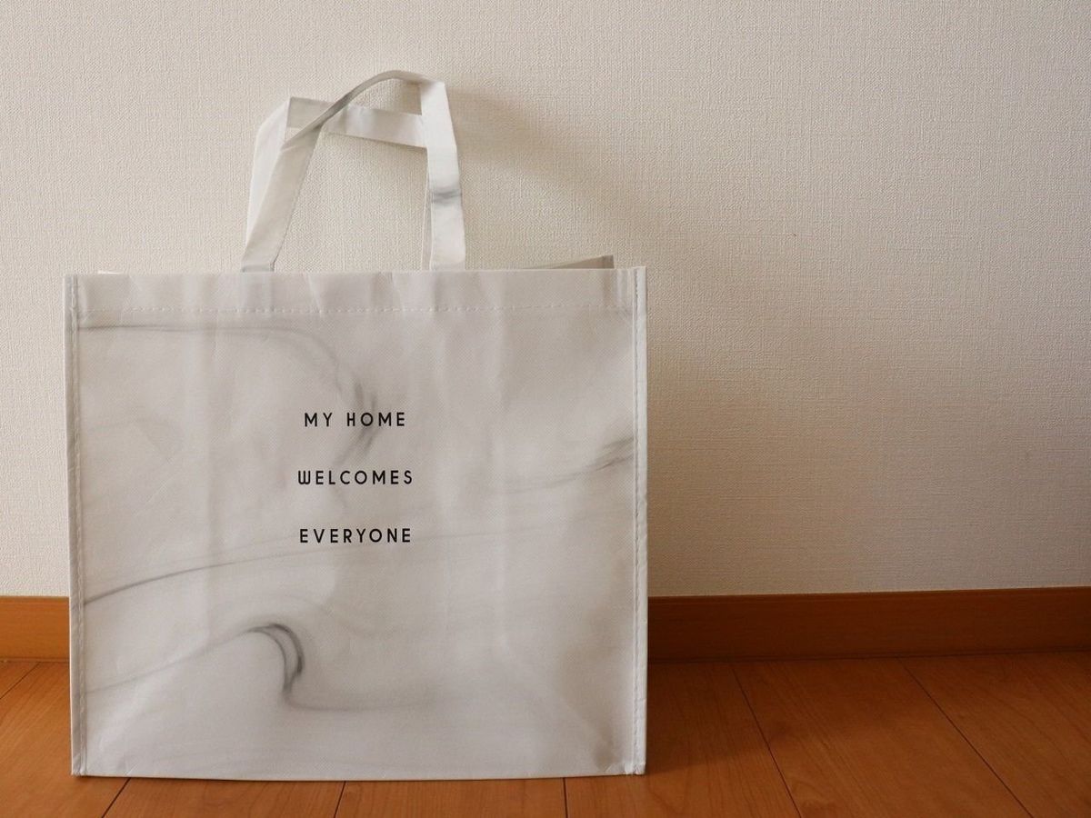 35×40×20cmと大きめなショッピングバック。お店でもらってきた紙袋を収納しておくときなどに便利そうなサイズ感です。大理石の柄とシンプルな英字が、そのまま置いておいてもカッコいい!価格は100円です。