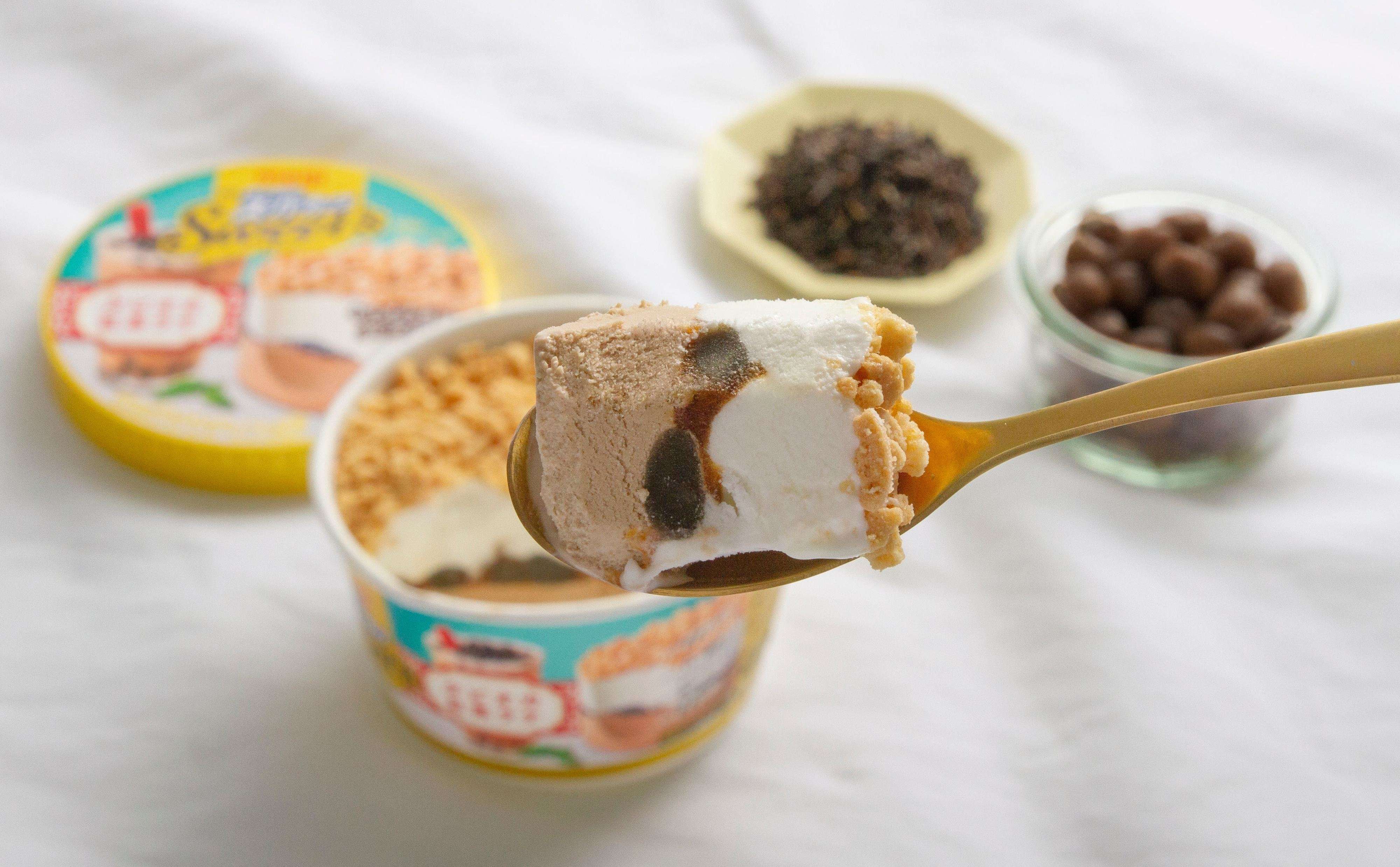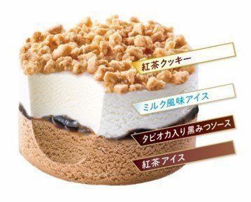 紅茶アイスとミルク風味のアイスでタピオカ入り黒みつソースを挟み込み、紅茶クッキーを敷き詰めることで、人気の“タピオカドリンク”を表現!タピオカ入り黒みつソースと紅茶クッキーの食感がアクセントとなり、層構造だからこそ感じられるスイーツになっています。