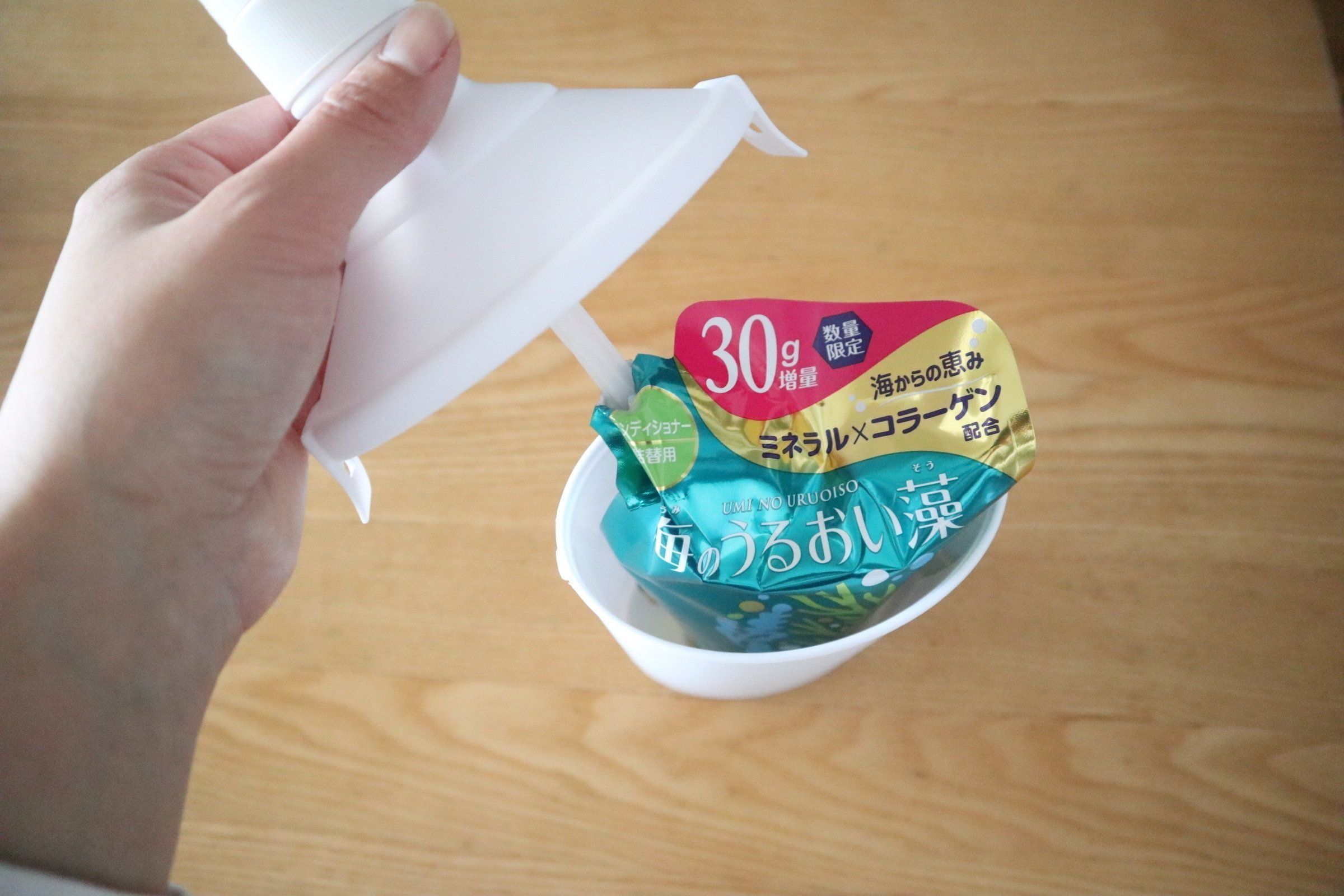袋ごと本体を入れて……詰め替え用の口を切り、ストローを差し込みふたをしめたら詰め替え完了!とっても楽ですよね!面倒な詰め替え作業から解放されてうれしい!