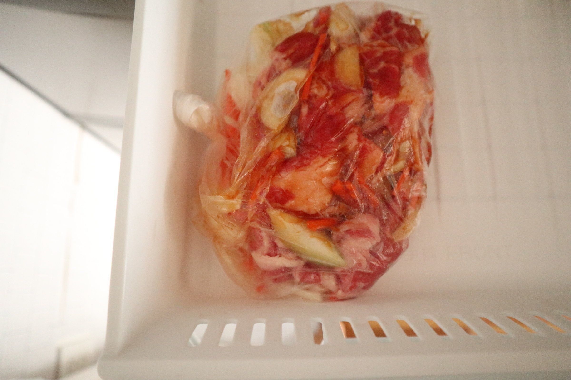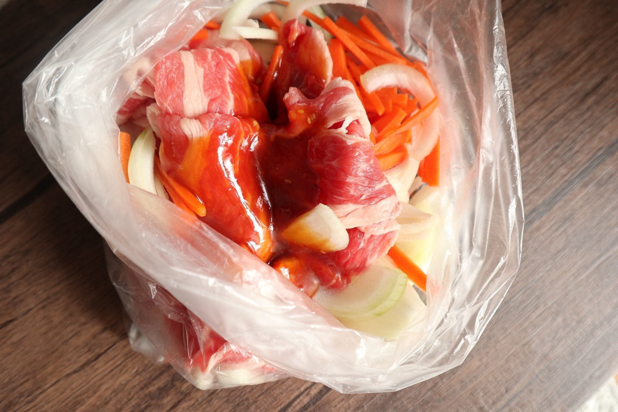 牛肉300gとお好みの野菜をポリ袋に入れて、プルコギの素も加えてもみこむ。