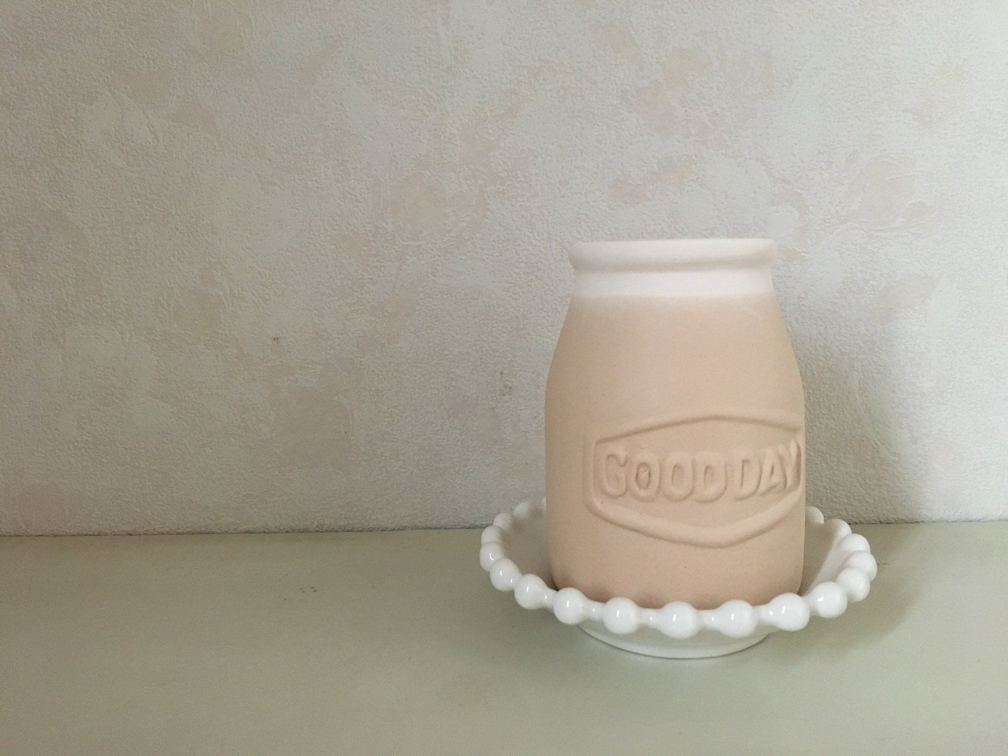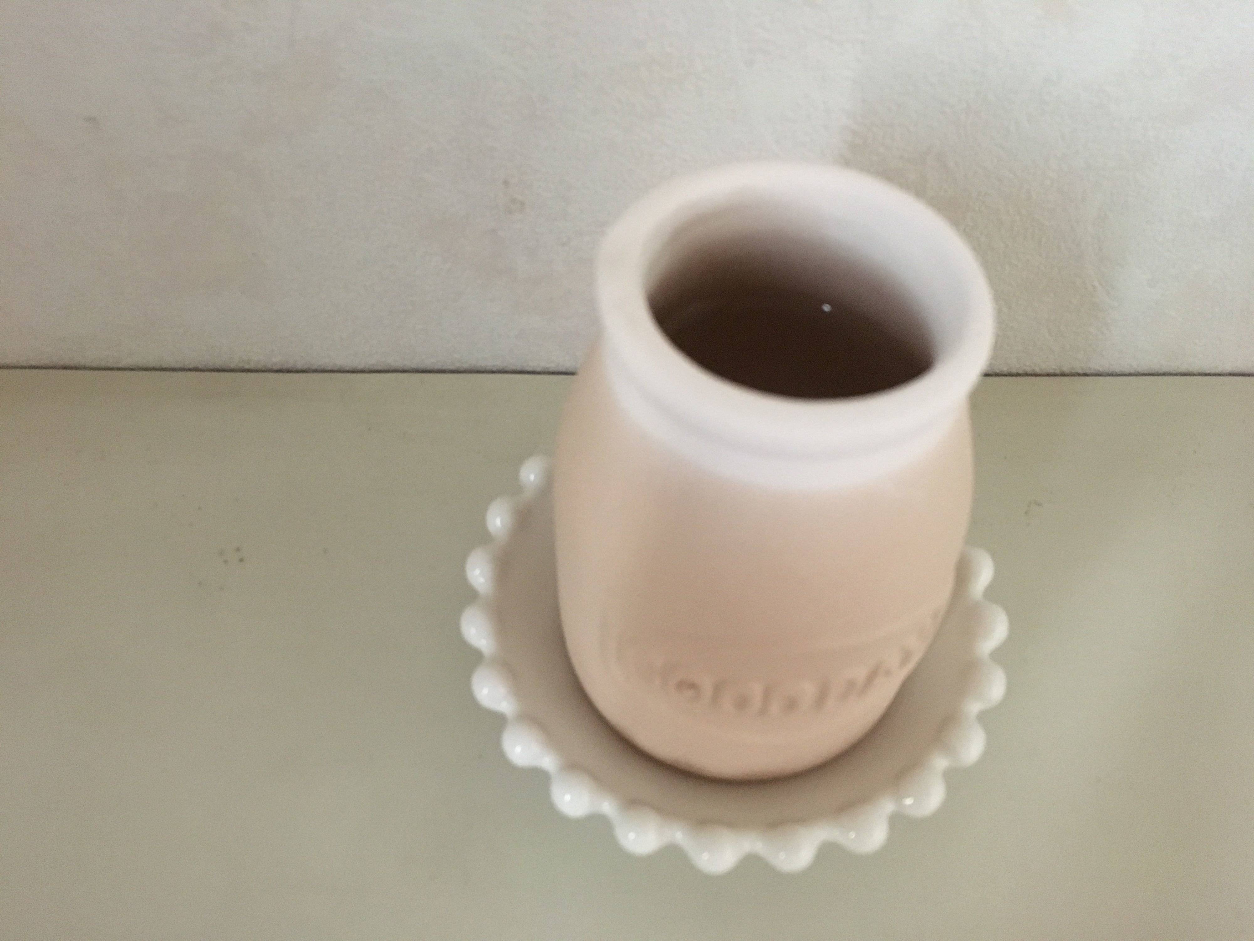 手のひらサイズの大きさで、説明によれば80ml程度の水を入れられるそう。ちなみにこの加湿ポット、同じくセリアで販売されているミルククラウンの小皿がピッタリマッチするんです! テーブルの上などに置いてもかわいいし、邪魔になりにくいですね。