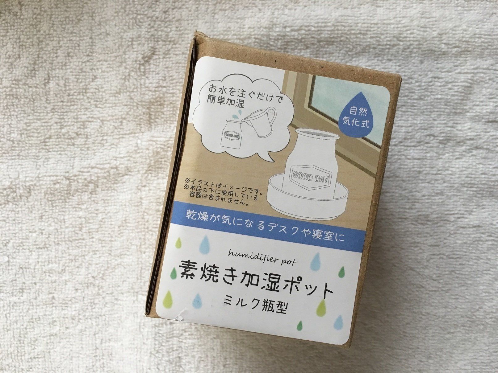 今回紹介するのは、セリアで見つけた「素焼き加湿ポット ミルク瓶型」。お水を注ぐだけで加湿の効果が得られるお手軽&お手頃アイテムで、価格は100円です。加湿は自然帰化式なので、もちろん電気は不要。