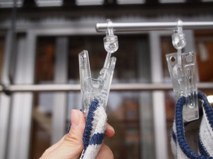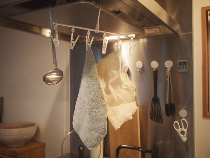 やりたかったことはこれ!「布巾をどう干すか…」と、いつも悩んでいましたが、これにて解決です。完全に乾いたら、場所を取らず収納も可能な「直線ハンガー」。素敵すぎる働きぶりです。スポンジなども干したかったので、これにてすべて解決です!