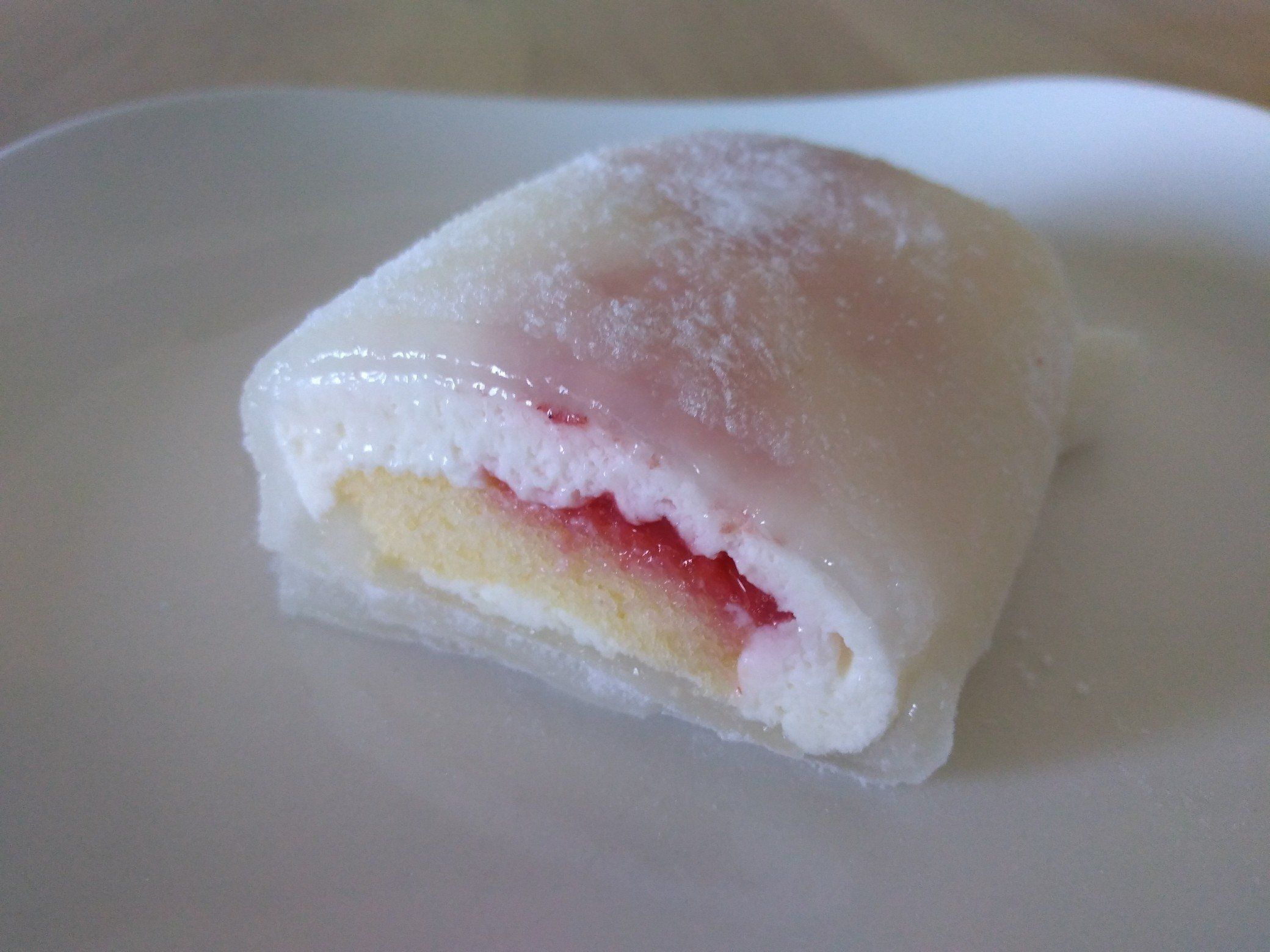 求肥の中は、スポンジ、苺ソース、レアチーズクリームです。