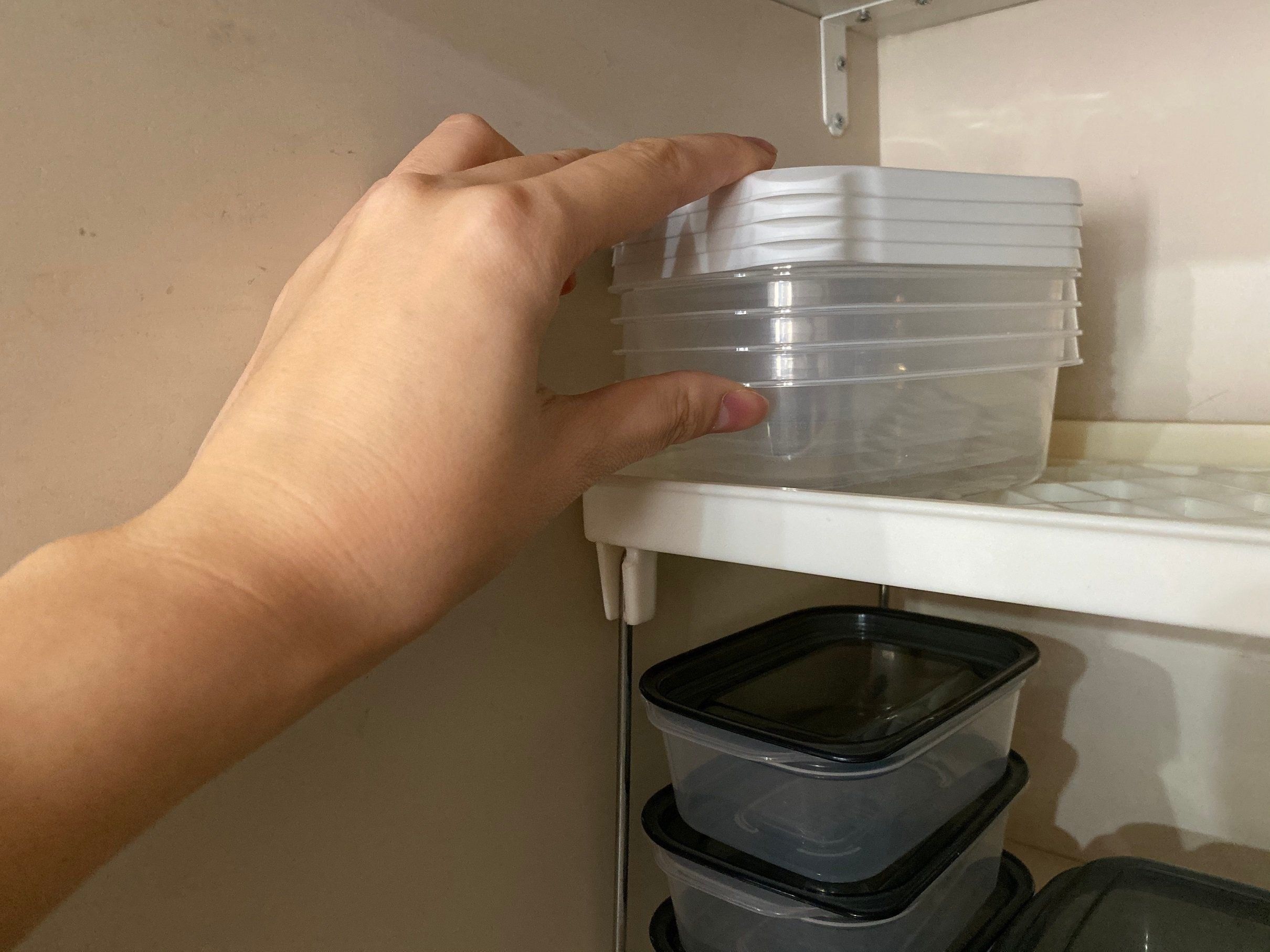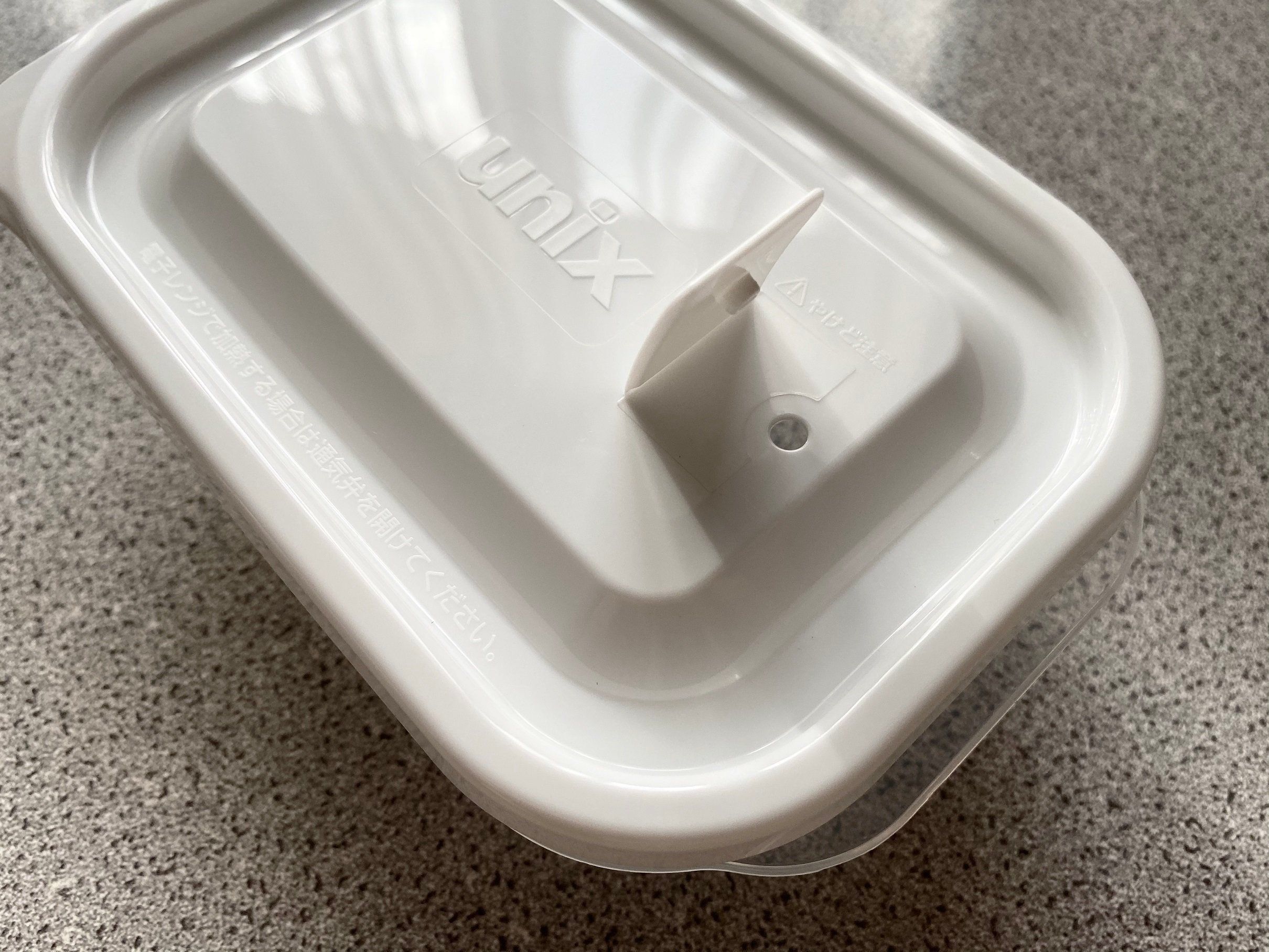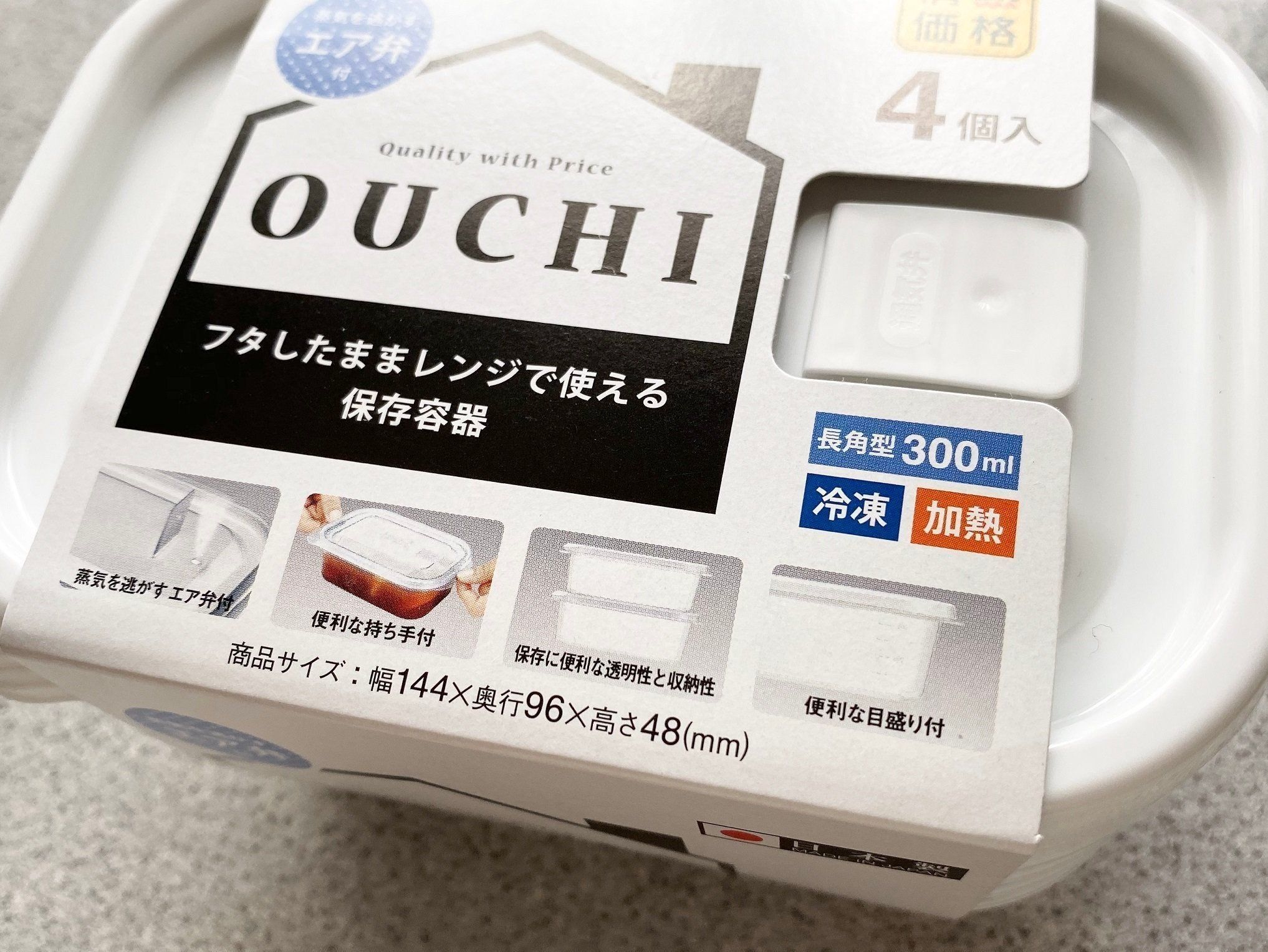 便利な保存容器「フタをしたままレンジで使える保存容器 長角型S」は、約14×9×5cmのものが4個セットで198円。白いフタには、通気孔のフラップが付いているので解凍するときはここを開けて電子レンジへ。