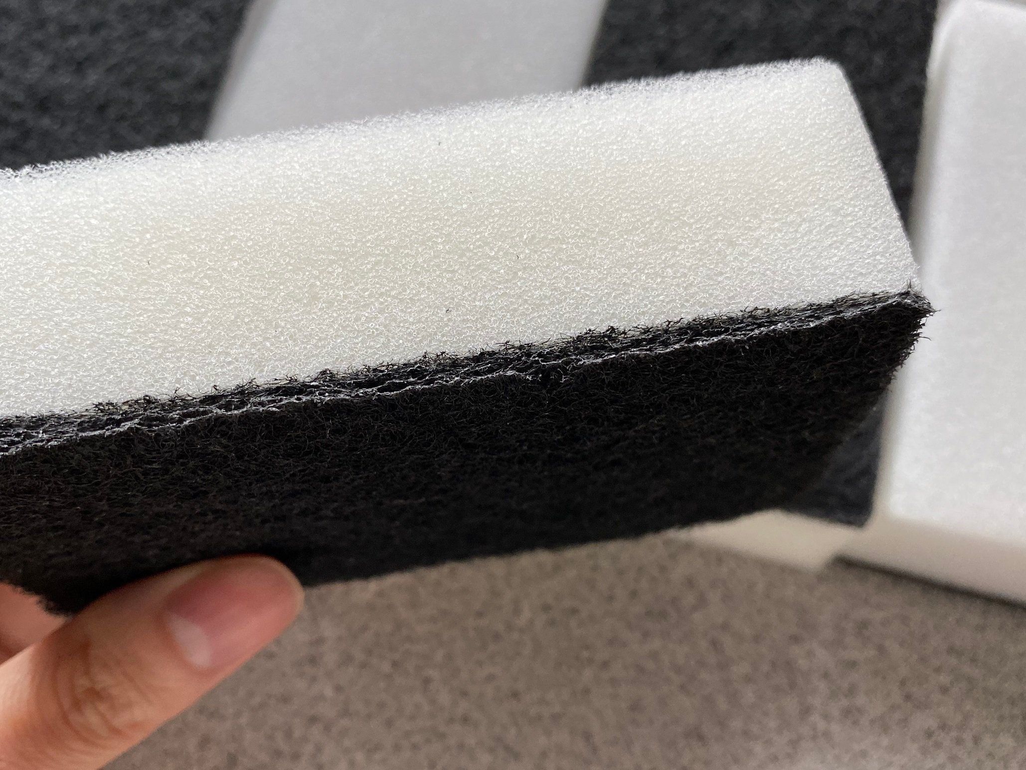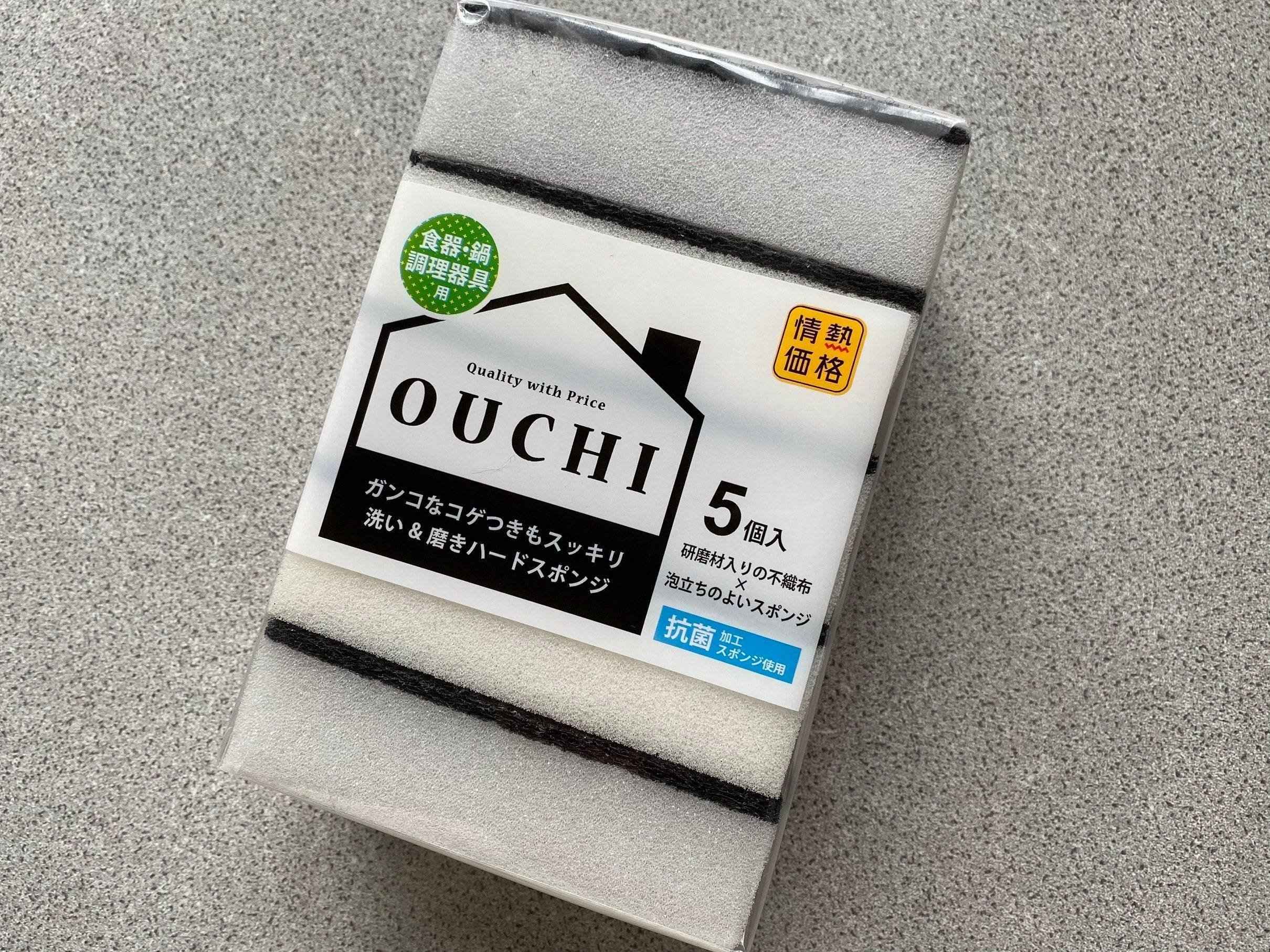 「ガンコなこげつきもスッキリ洗い&磨きハードスポンジ」は5個入りで98円と、お得感のある商品。濃いグレーの研磨材入りの不織布と白か薄いグレーのスポンジが合わさった抗菌スポンジです。普段使いの食器洗い用にピッタリ!