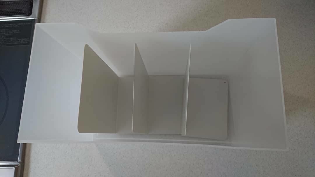 写真のようにファイルBOX内にブックエンドを3つ設置すると、キッチンアイテムの効率的な収納が可能に!