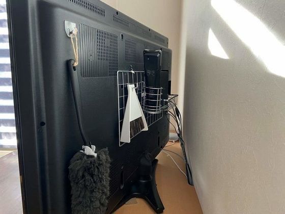 TVボードに直置きしているものもほとんどないのでお掃除もしやすくてTV裏収納はおススメです。因みに設置は結束バンドを使っているだけ。これも100円ショップで手に入ります!