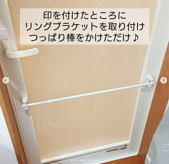 浴室のドアにリングブラケットを貼ってつっぱり棒を差し込むと、あっという間にバスマット収納が完成!扉とドアにすき間ができるから通気性がよく、早く乾かすことができるのも、リングブランケットを使ったバスマット収納のメリットです。
