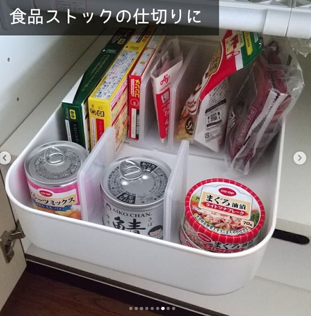 インスタグラマーは伸縮収納トレーを、シンク下の引き出しの整理整頓に役立立てているのだそう。M、Lサイズ複数個を向きを変えて組み合わせることで、奥行きのある引き出しにもシンデレラフィットさせることに成功しました。これなら、食品ストックを種類別に収納できてスッキリ。こんなに便利なのに110円なのが信じられない神アイテムです。