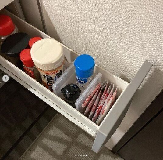 こちらはセリアの引き出し用仕切りを使ってキッチンの調味料入れを整理している例です。仕切りは連結できるので、収納の大きさに合わせて調整することが可能です。
