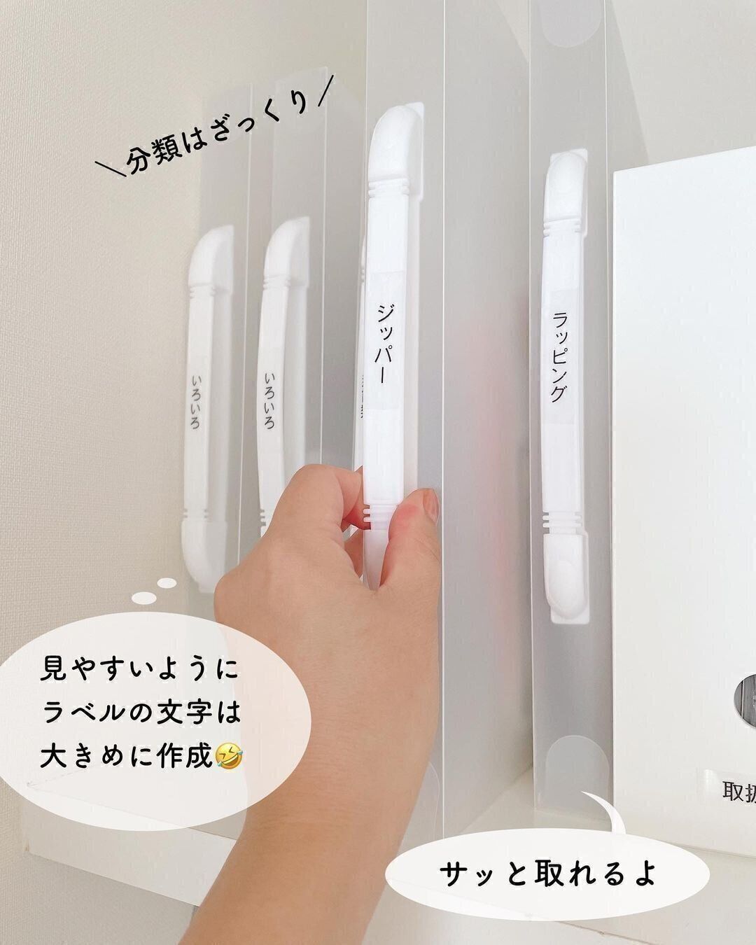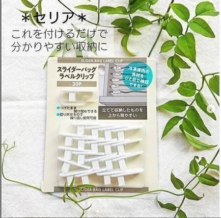 こちらの「スライダーバッグラベルクリップ」。保存袋のジップバッグのスライダー部分に取りつけて、ラベリングをすることができます。引き出しタイプの冷凍室や野菜室で使うことも多いジップバッグ。立てて収納すると便利ですが、これをつければ、あけると何が入っているかがすぐにわかるんです。こういうのを探していた!というインスタグラマーさんが多数です!