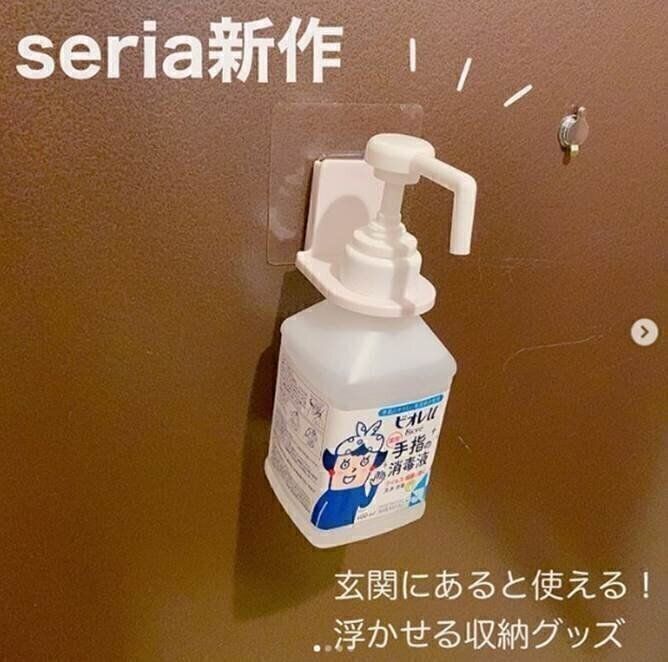 こちらは「吸着シートタイプのボトルホルダー」を使って玄関扉にアルコールをひっかけておくアイデアです。家に帰ったらまずはアルコールでシュッ!これなら、子どもたちの手の届く高さにひっかけておくことができますね!