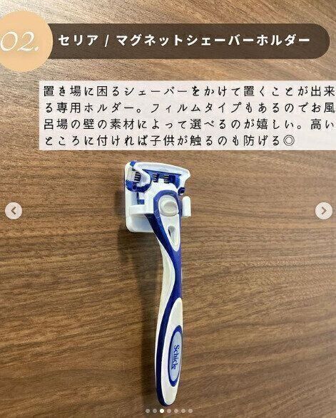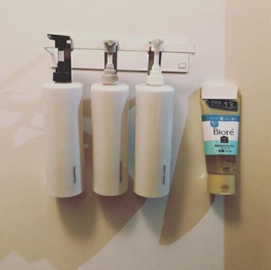 お風呂場など水まわりは吊るす収納が衛生的で便利!チューブを吊るすマグネットは、そのままお風呂の壁にペタリと貼りつけることができるので、とっても楽です。
