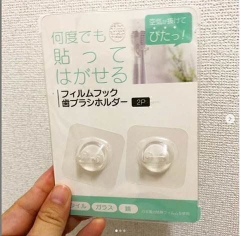 何度でも貼ってはがせる「フィルムフック歯ブラシホルダー」。鏡や壁にペタッとはりつけて、突起部分に歯ブラシをひっかけます。コップなどに入れておくと、どうしてもヌメヌメしてしまう歯ブラシ収納。このホルダーなら、ヌメヌメとはもう無縁です!