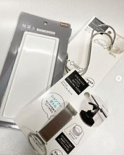 片づけには欠かせないと言ってもよいほど重宝するのがセリアのボトルハンギングフック。シャンプーなどのボトルを吊り下げて収納することができるので、浴室や洗面所などもすっきりしてお掃除が楽になります。