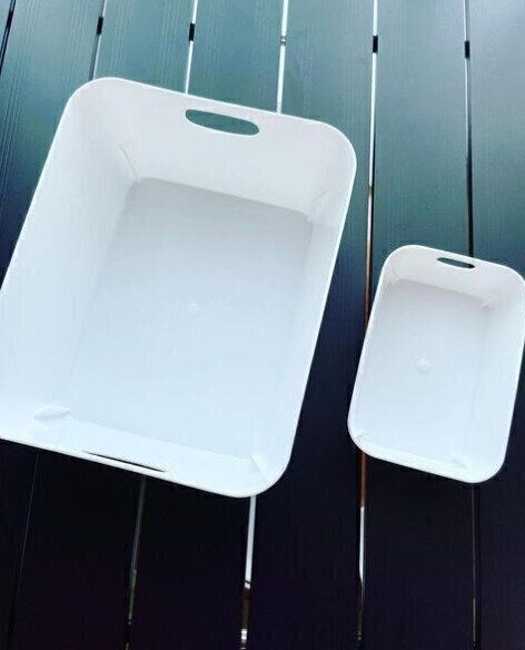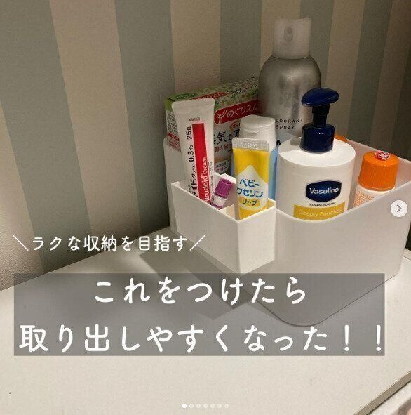 セリアのハンドルつきソフトライナーケースのホワイトは少し小さめのサイズだから、こまかいものを収納するのにぴったり。日用品などを種類ごとに入れるのにちょうどよいですね。