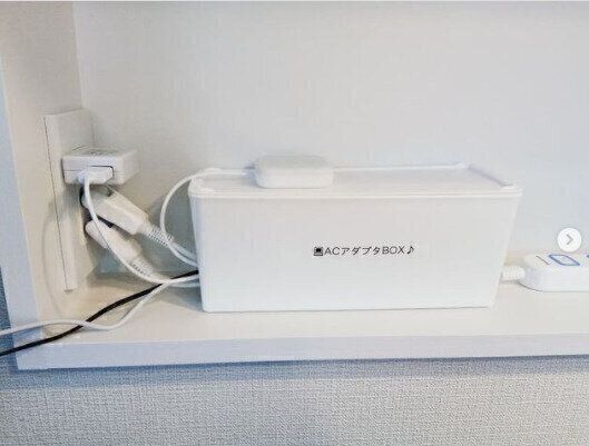 ケーブルのタコ足配線やごちゃつきはやはりインテリアの見栄え的によくありませんよね。こちらはセリアのケーブル収納ケースにケーブルをきれいにまとめて収納している例です。とてもすっきり見えますね。
