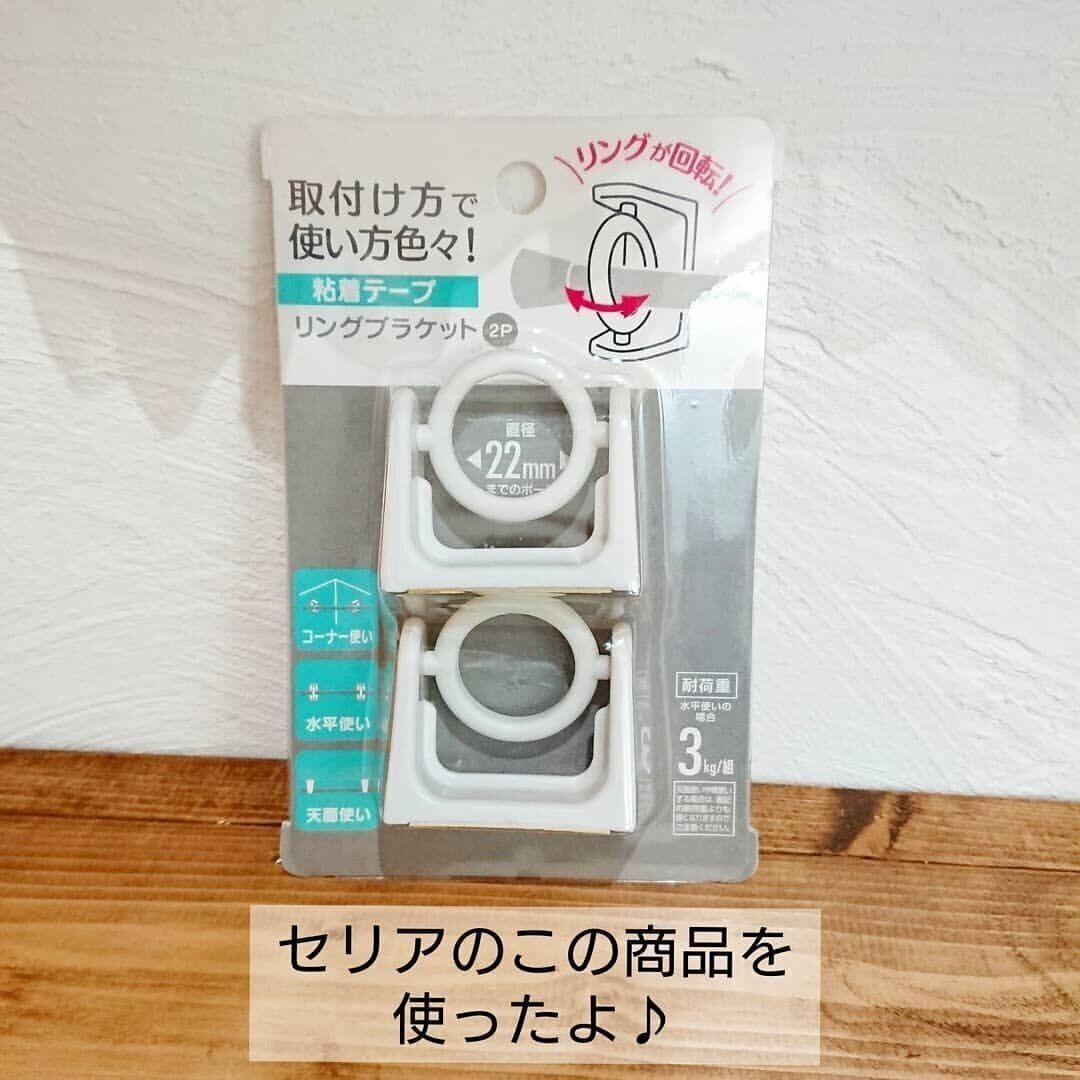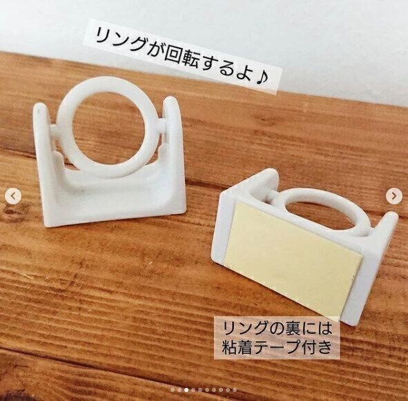 セリアのリングブラケットは、バスマット収納をつくるときに便利なアイテム。リングが回転する構造になっているので、コーナー使い・水平深い・天面使い、いろいろな場所で活躍してくれます。粘着テープで設置可能で、簡単に取りつけられるのも魅力。
