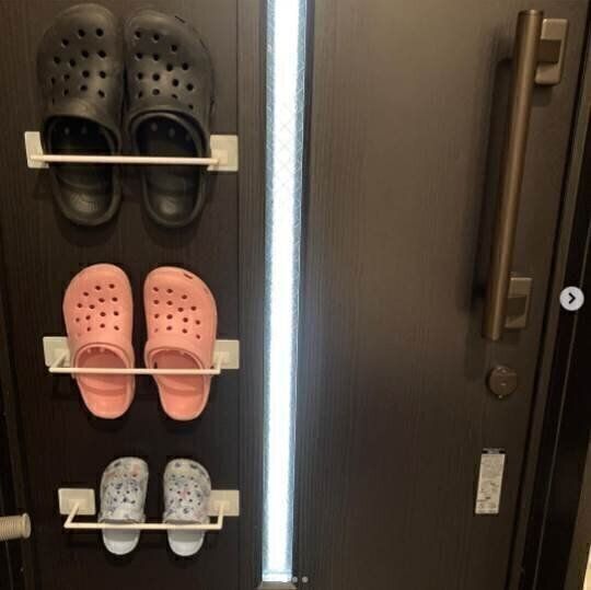 毎日使うサンダルは、靴箱にしまいこむと面倒。だからといって出しっぱなしは邪魔になる。そんなときはこれです。「貼ってはがせる吸着シート」シリーズのマルチバーを使って、玄関扉にサンダル収納をつくったアイデアです。タオルかけとして使うのが一般的ですが、こんな使い方もあったんですね!