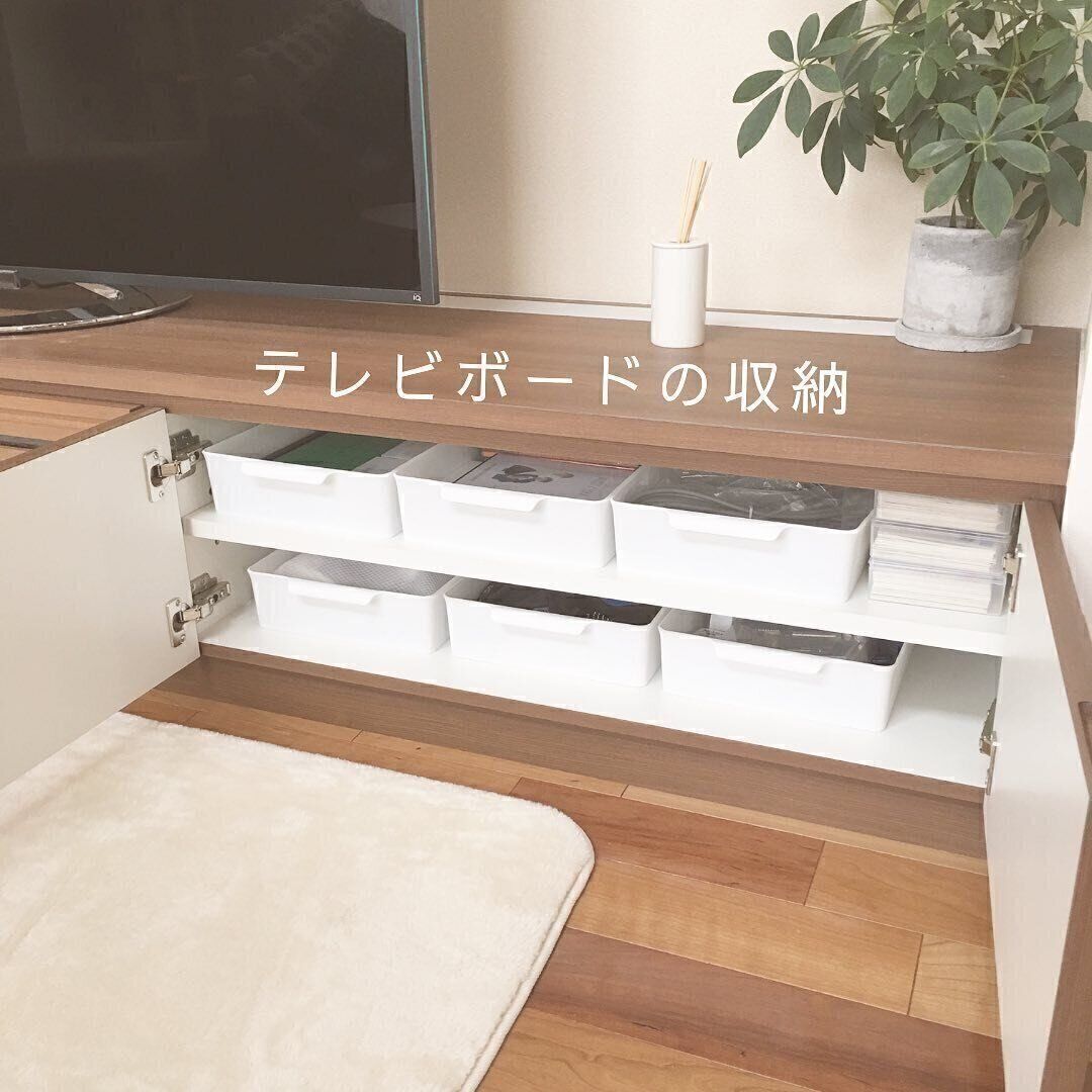 テレビボードの棚に入れる収納ボックスをセリアの収納ケースで統一するアイデアは、誰でも取り入れやすいのでおすすめです。白のケースならシンプルなので、清潔感があって、どんな家具にもなじみます。収納ケースにラベルをつけておくと、整理整頓をするのに便利ですね。