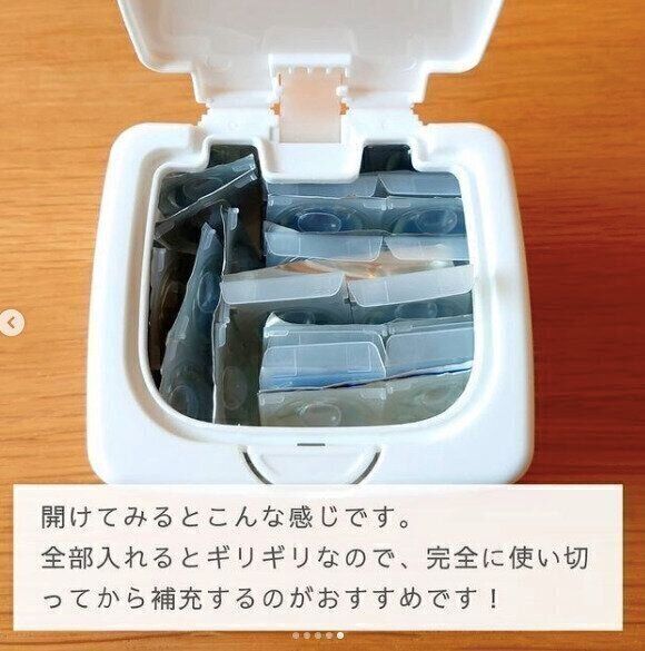 コンタクトレンズは、ワンセットずつ切り離してケースに詰めていくと、ぴったり収納できますよ。左右で度数が違う人は、ツインタイプを購入するのがおすすめ。シンプルなデザインなので、度数やメーカーを記載してリメイクするのもいいですね。