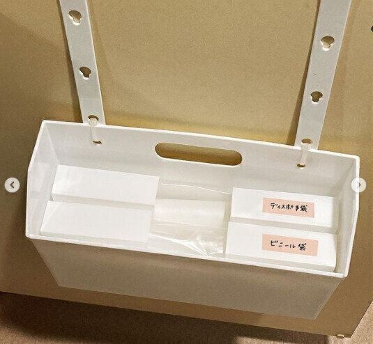 セリアの扉用4連フック、メールボックスL、キッチン消耗品収納ケース、収納バンドを使って使い捨て手袋とビニール袋の収納をつくっている例です。どれもシンデレラフィット!きれいに収納できていますね。