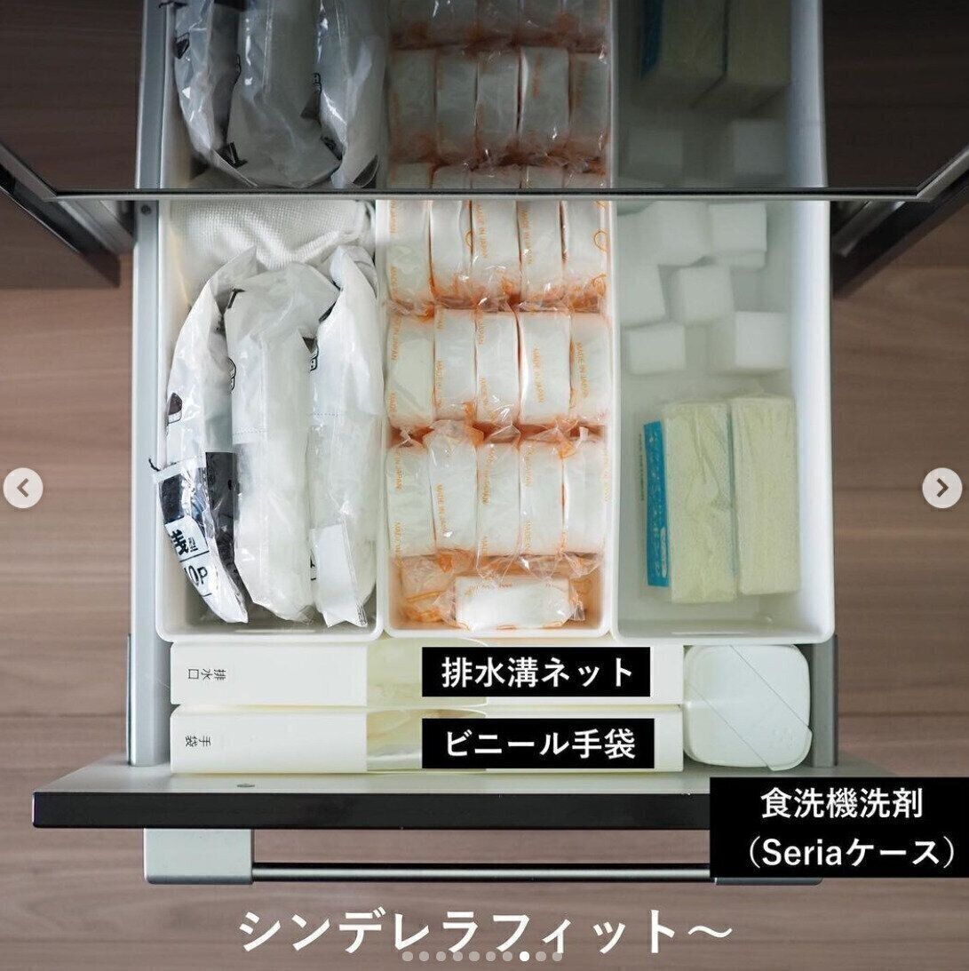 こちらは、ライナーケース スリムL型を活用した素敵な収納アイデア。食洗機下の引き出しにライナーケースを並べてスポンジ・フィルターなどのストックアイテムを収納し、ビニール手袋や排水溝ネットなど、頻繁に使用するものを手前に収納しています。必要なものを手前に持ってくれば、引き出しも少ししか開けなくていいので快適です。