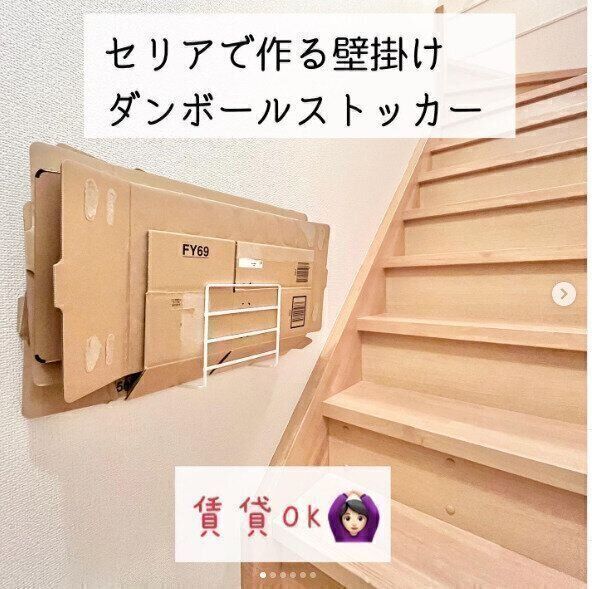 石膏ボード用フックで壁に取り付ければ、浮かせるタイプのダンボールストッカーに大変身します。想像以上にたくさんダンボールをストックできるのはもちろん、置き型タイプとは違い掃除がしやすいのもうれしいポイントです。
