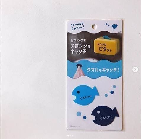 デザインもかわいいこの「スポンジキャッチ」は、シンクにぴたっと張りつけることができ、しかも繰り返し、はがして使うことができます。スポンジはこのおさかなにくっつけるだけ。落ちない!なんで?すごい!とインスタグラマーさんの間でも大人気です。