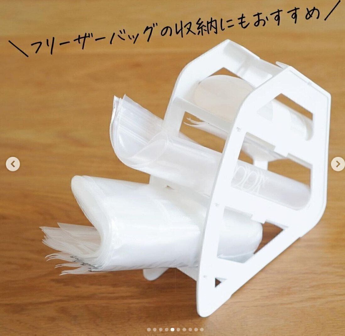 取り出し楽々!ラップスタンドは、フリーザーバッグ、リモコン、スタイリング剤、化粧水など、さまざまなアイテムをすっぽりと収納できる便利アイテム。斜めに入るので取り出しやすさも◎です。見た目もシンプルでコンパクトなサイズ感なので、ちょっとした隙間に置いておけますよ。