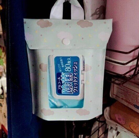 見栄えのあまりよくないふたつきのアルコール除菌ティッシュもそのままケースに入れて吊り下げることができます。玄関先などに置けば帰宅後すぐに使えて便利ですね。