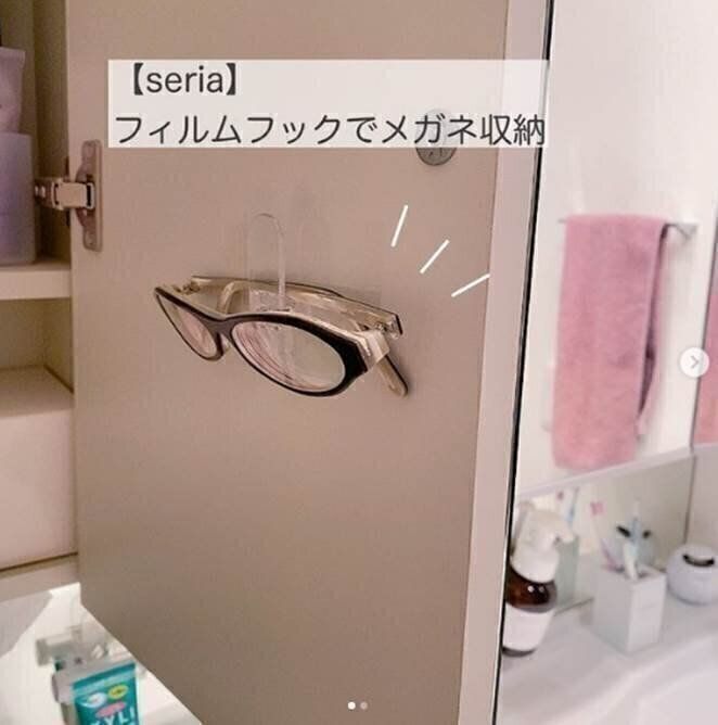 洗面所に置きっぱなしになることも多いメガネ。収納に頭を悩ませているあなたにはこれがおすすめ!セリアで大人気の「フィルムフック」シリーズの「コップホルダー」を洗面台の鏡裏収納に取りつければ、メガネがほらこのとおり。これはマネしてみたいアイデアです!
