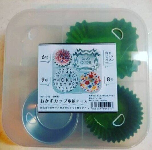 こちらはセリアのおかずカップ収納ケース。おかずカップには小さめの6号サイズから大きめの9号サイズなどさまざまですが、あらゆるサイズのおかずカップを収納することができます。バラバラになりやすいピックも収納することができますよ。