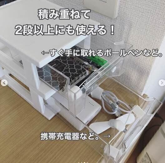 「デスクラボシリーズ」のプルケースは、どこにでもなじむシンプルなデザイン。文房具や充電コードなど、部屋のあちこちに散らかりがちな小物を整理するのにもってこいです。引き出しの開け閉めもスムーズで、重ねて使うこともでき、110円という値段ながら、立派な収納ケースとして大活躍してくれます。