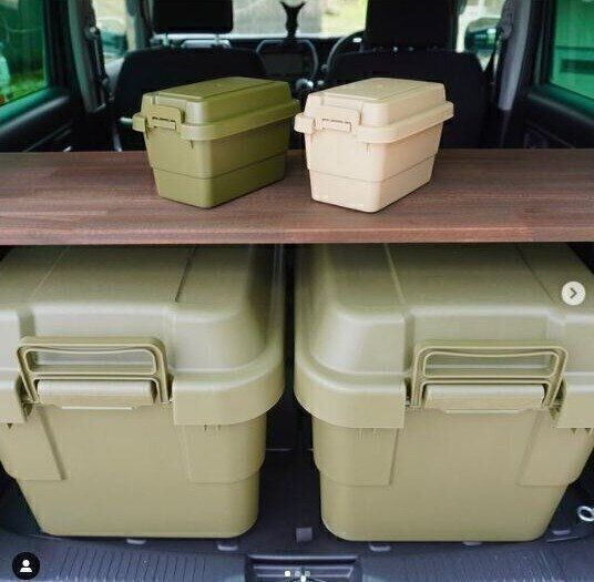 ベージュとグリーンのカラーバリエーションがあるセリアのコンテナボックス。アウトドアの小物を入れるのにちょうどよさそうなデザインとサイズですね。