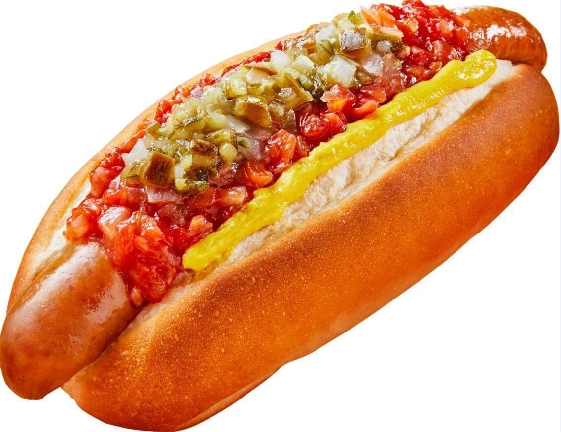 パリッとジューシーでパンからはみ出す大きさのソーセージの上から、ダイス状にカットしたトマト・オニオン・ピクルスを合わせ、味のアクセントにハラペーニョを効かせました。